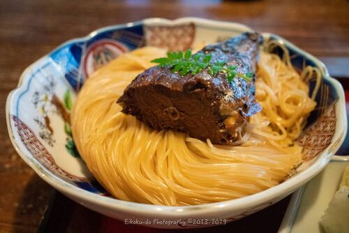 焼鯖そうめん 折角、長浜市に来ているのですから、滋賀のご当地メニューを食べてみたい。そう思うのは必然ですよね。長浜駅の近くで、ガイドブックの先頭に載っているお店が今日のお店です。 北国街道に面した築200年の商家の建物を活用した店舗で、おお〜っ…