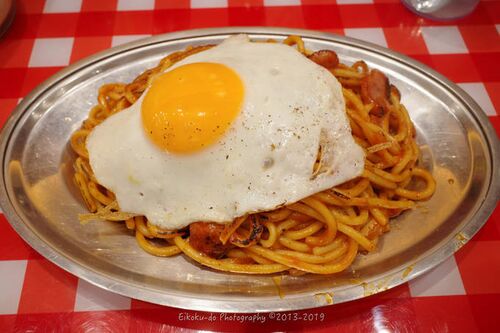 ナポリタン(並)目玉焼き 後学のために展示会やセミナーを受講しています。 この日は近所の幕張メッセ。午前中のセミナーを聴講し、午後に妻に迎え来て貰いました。お迎えの対価は遅めのランチです。海浜幕張駅前に古くからあるプレナ幕張内の飲食店で、展…