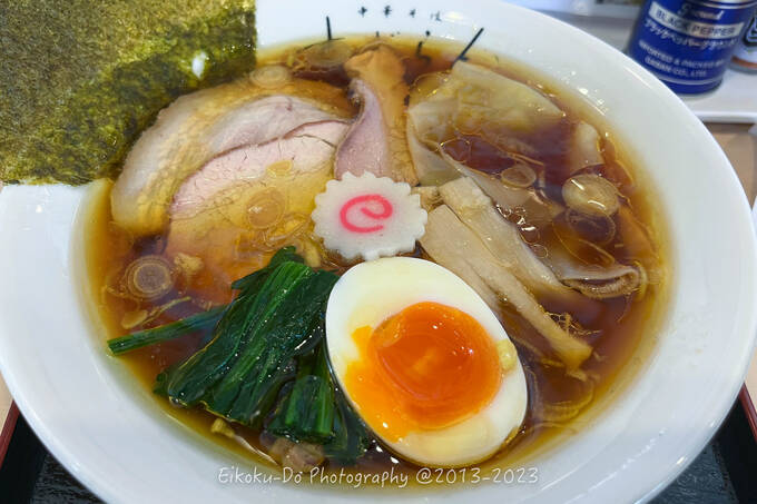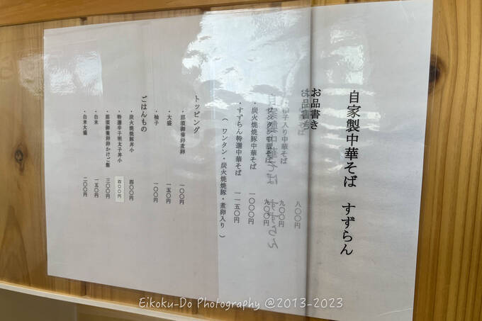 想像した通りに30分くらい待って、私のラーメンが着丼です。特に理由はありませんが、すずらん特製中華そばにしました。1,150円です。タンワン、炭火焼焼豚、煮玉子入りです。店内のお品書きにはいろいろ書いてあり、会津地鶏と那須御養鶏から作った鶏油を使っています。ビジュアルはオーソドックスな白河ラーメンです。インスパイアでもなく、白河ラーメンそのもの。鶏油が光っていて美味しそうです。麺は自家製麺ですが加水が高いですが、私は早食いなので問題ありません。