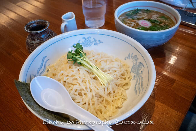 妻はつけ麺です。どんだけつけ麺が好きなんでしょう。いつもつけ麺です。もり中のつけ麺です。白河の流れのお店らしく、超多加水の平打ち縮れ麺です。つけ麺なので麺量は多めです。濃厚魚介豚骨系のつけ麺が多い中で、こんなシンプルなつけ麺はあっさりさっぱりし過ぎる様な感じがしますが、何気に美味しい。スープの濃い薄いの調整も自分である程度できそうです。