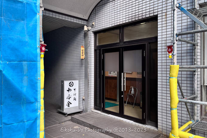 今はビルの一階の奥にあるお店ですが、創業当時はどんなお店だったのでしょうね。この時はビルの修繕中で足場とブルーシートで覆われた隙間からお店の入り口が覗けました。扉の密閉度が高いためか、厨房の換気の大きな風切り音がしています。お店の中はオフィスの様な空間にテーブルや小上がりがありました。