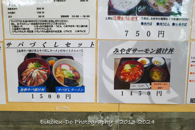 私は「サバ尽くしセット」です。金華鯖の漬け丼と、さば出汁ラーメンのセットという豪華鯖つくしのセットです。最上塩鶏そばです。石巻魚市場が発表している金華鯖は、金華山沖で漁獲され、石巻港に水揚げされた旬の大型の真鯖となっています。この金華さばの漬け丼はなかなかです。そして、昔から料理にサバだしや鯖節を使う食文化があった石巻の北部の、その食文化から誕生した魚介系ラーメンです。石巻専修大学と各種事業者が共同で開発した風味豊かなスープのラーメンが美味しい。麺は極細のちぢれ麺で、イワシのつみれが最高です。