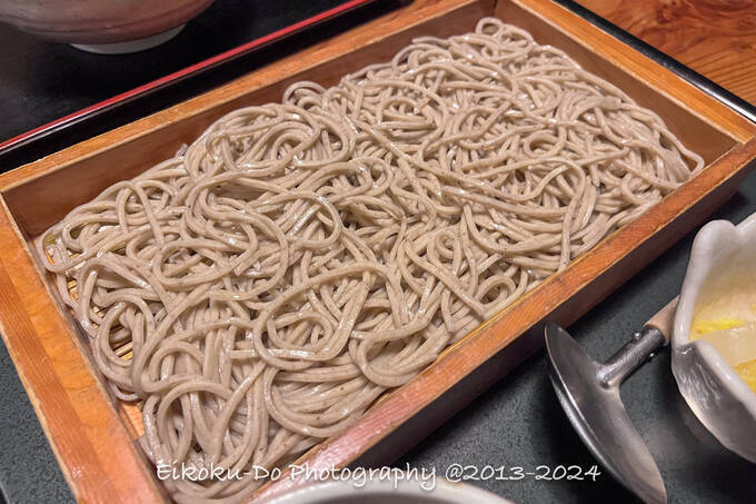 私は、もう一つの山形そばの名物の板蕎麦です。大き目の長い木箱にそばを盛り付け、大勢で食べた習慣のようですね。板蕎麦は一般的に量が多く、普通のざる蕎麦の5割増し程度の量があります。これは食べるの大変でした。