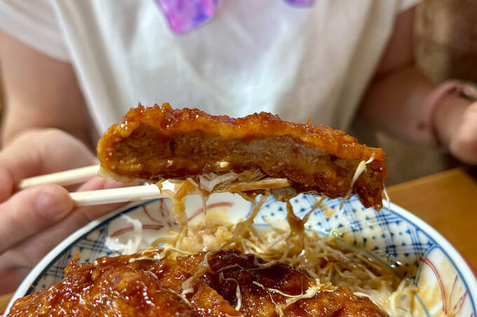 妻は興味をそそられた様で「ロースソースカツ丼」です。これで850円です。出てきたソースカツ丼を見て、大丈夫か?と思いました、悠然と箸をつけてました。大きくて肉厚のあるロース肉のカツを濃厚な自家製ソースに漬けて、丼ご飯に乗せています。この地域ではカツ丼を注文すると、このソースカツ丼が出てくる様です。私たちが知っているカツ丼は煮込みカツ丼と言っていると聞きました。信じるか信じないかは貴方次第です。でもこれ、マジで美味しいですよ。