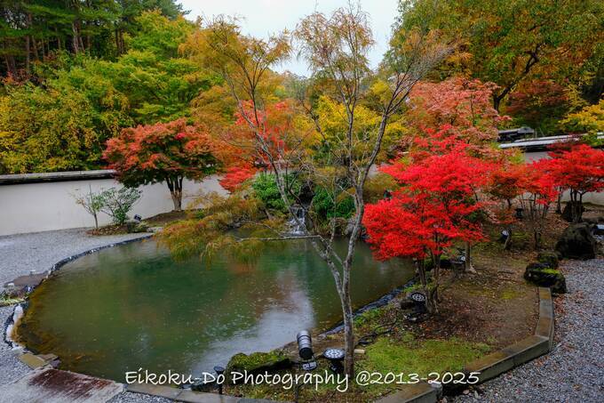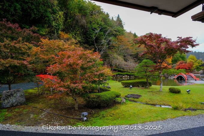 到着すると、天気はあいにくの小雨模様。ですが、この雨が思いがけない幸運を運んでくれました。広大な園内にはほとんど人の姿がなく、まるで平安時代にタイムスリップしたような空間を、妻と二人で「貸切り」状態。紅葉も大松沢家と同じく、色づき始めといったところ。真っ赤な紅葉も良いですが、雨に濡れた緑、黄、赤のグラデーションがしっとりと美しく、これはこれで最高の風情です。