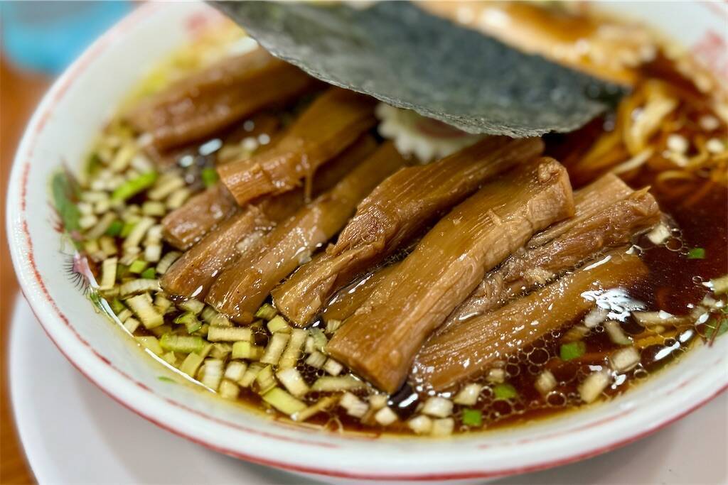 運ばれてきた「めんまらーめん」。 丼を覗き込むと、そこにはメンマ好きにはたまらない光景が広がっています。美しく透き通ったスープの上に、これでもかと盛り付けられた大量のメンマ。まさに主役級の存在感です。