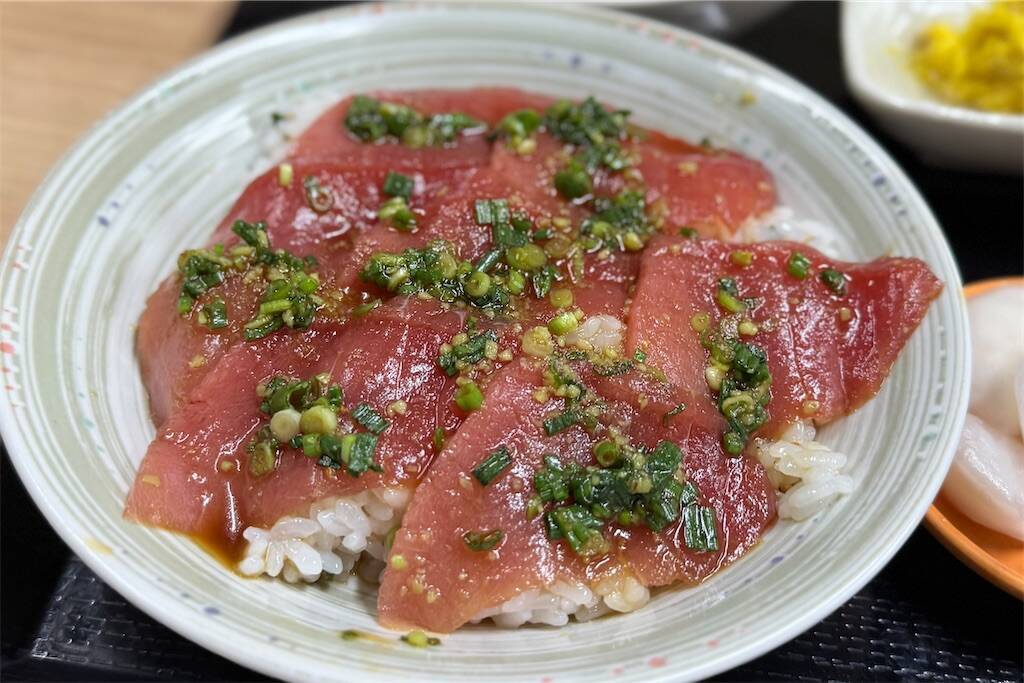 フライとビールでいい気分になったところで、食事の締めくくりへ。 注文したのは「まぐろ漬け丼定食」です。 メニューには「本まぐろ」と書いてあったような気もしますが、食べてみると…うん、美味しいけれど、これは普通の「まぐろ」かもしれません(笑)。でも、そんな細かいことは気にならないほど、特製のタレにしっかりと漬け込まれた赤身はねっとりと美味しく、ご飯との相性は抜群。温かいお味噌汁と共に、胃袋に優しく収まりました。